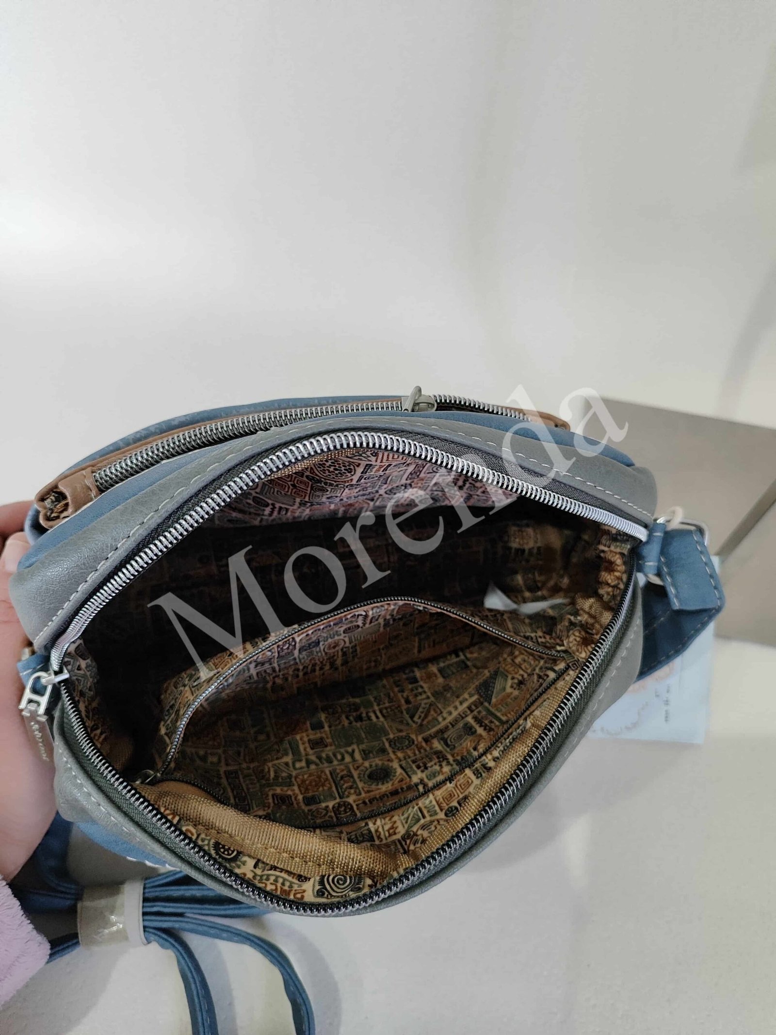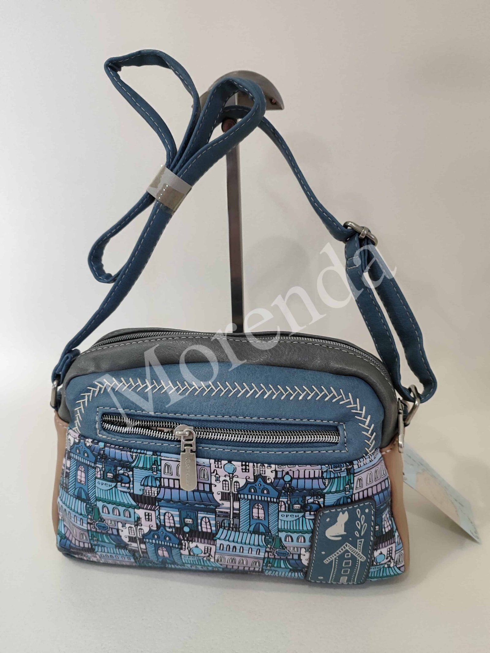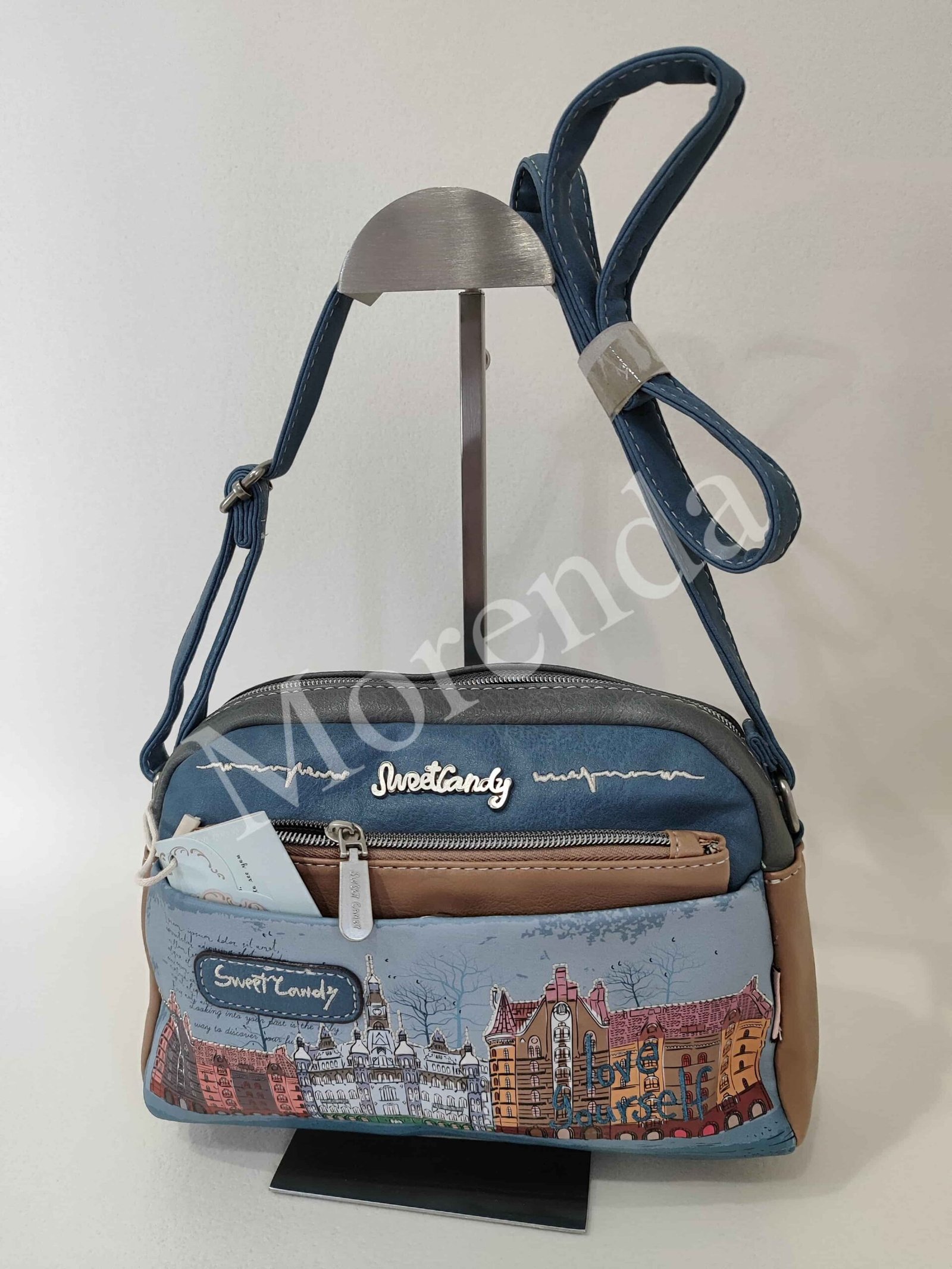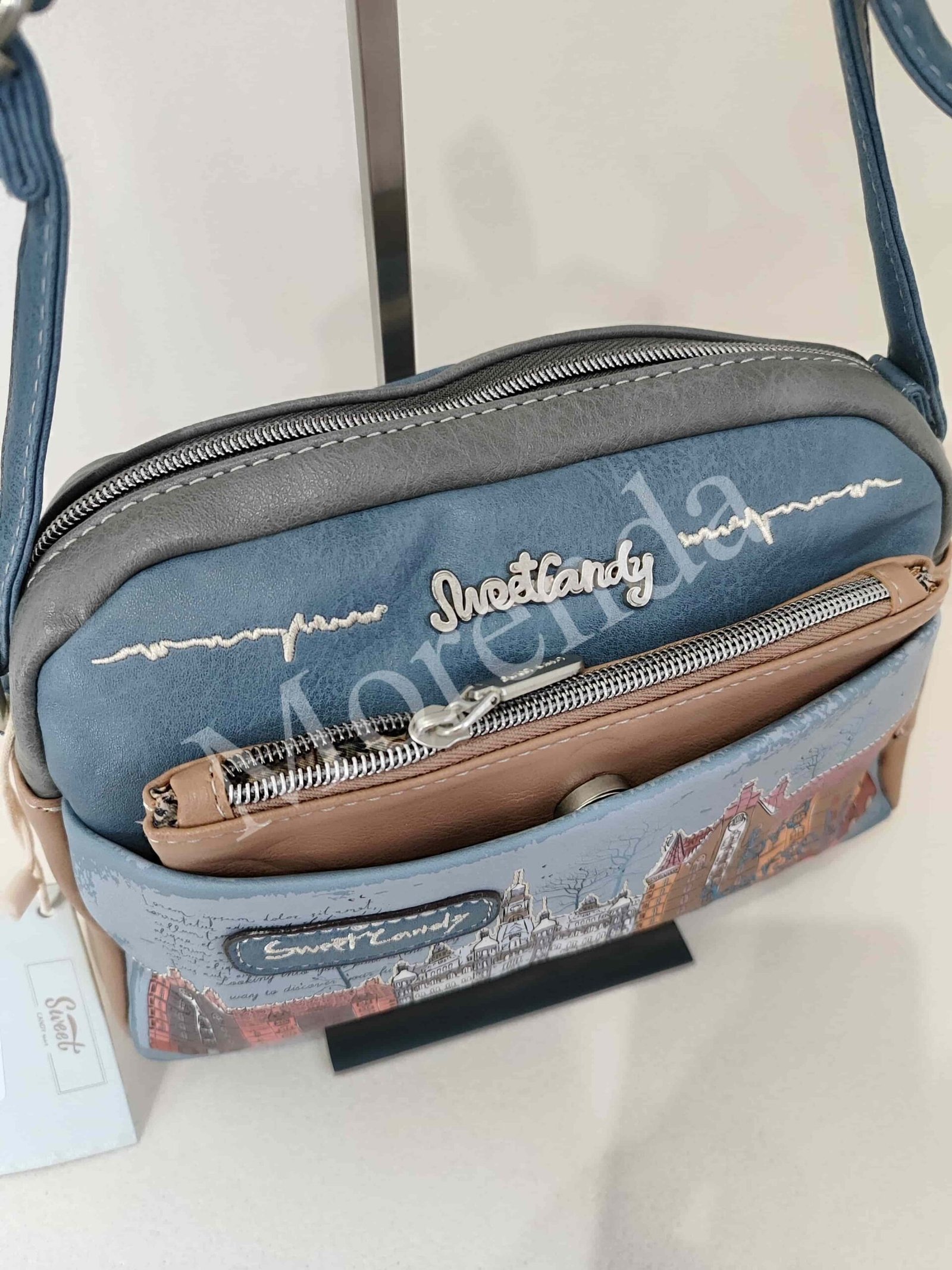 Bandolera Sweet Candy estilo urbano en tonos azul y beige, con diseño ilustrado tipo ciudad. Compacta y práctica, cuenta con varios compartimentos con cremallera para organizar tus objetos personales. Incluye correa ajustable para mayor comodidad en el día a día. Ideal para uso diario, viajes o salidas.